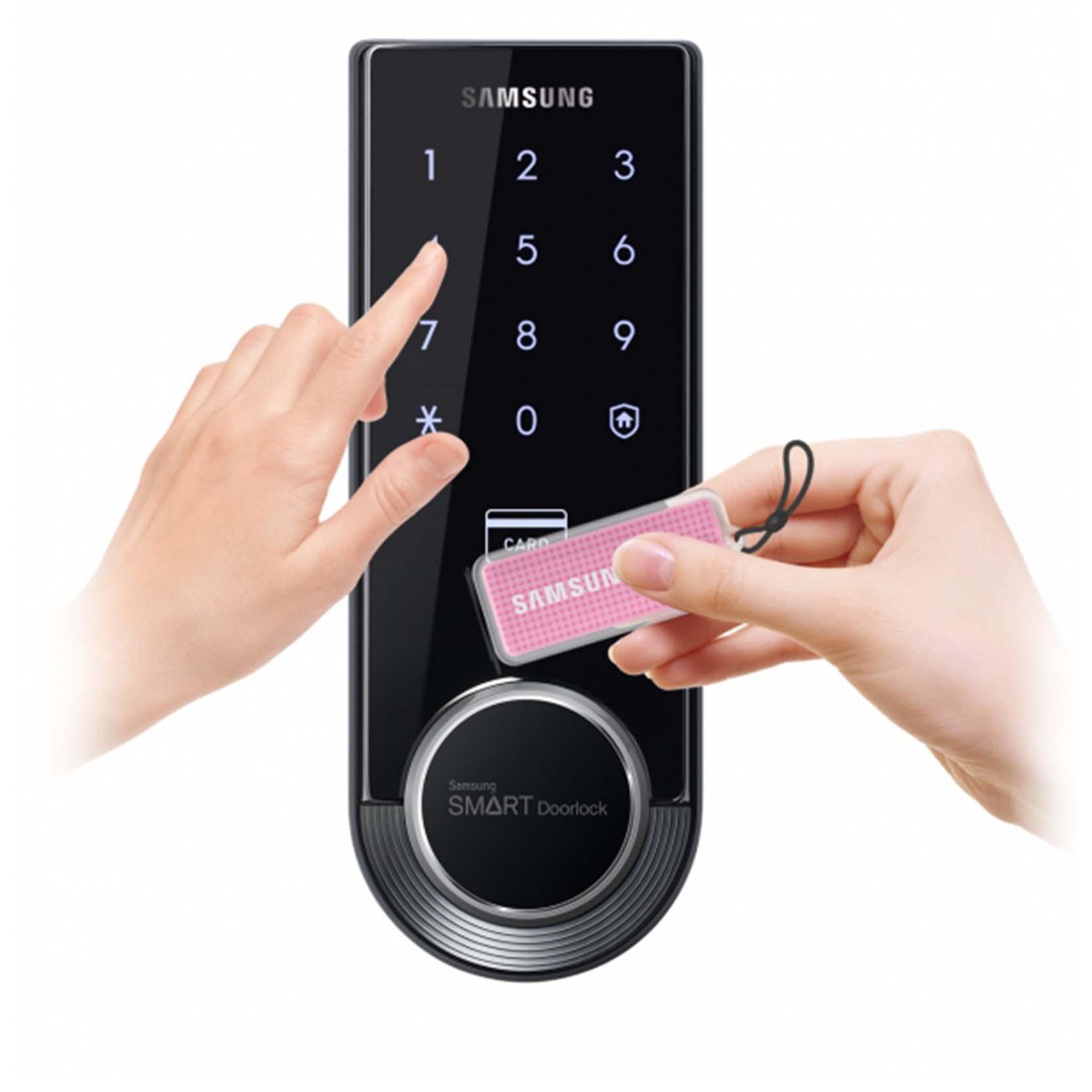 - Mã số: Việc mở khóa bằng mã số trên khóa cửa điện tử Samsung SHS 3321 được thực hiện như đối với các sản phẩm khóa cửa điện tử khác của hãng. Bạn tiến hành nhập dãy số có độ dài 4-12 ký tự, sau đó nhấn * để mở khóa.
